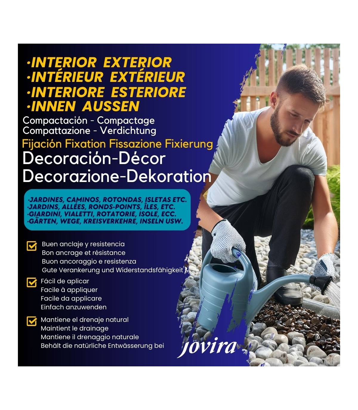 Fijador superficial de uso interior y exterior para decorar jardines, caminos, rotondas, isletas, etc, sitios en los que habitualmente no hay tránsito de personas, proporcionando un acabado decorativo y funcional. No cambia de color ni amarillea con la radicación solar. Mantiene el drenaje natural del aglomerado de áridos Compactación y fijación de áridos triturados como mármol, piedras, gravillas. Buen anclaje, dureza y resistencia al exterior. Fácil de aplicar.